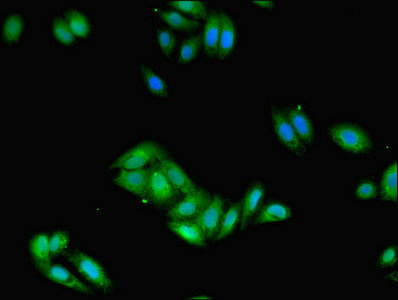 • Immunofluorescent analysis of HepG2 cells using CSB-PA008533LA01HU at dilution of 1:100 and Alexa Fluor 488-congugated AffiniPure Goat Anti-Rabbit IgG(H+L)