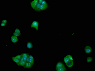 Immunofluorescence staining of MCF-7 cells with CSB-PA008546LA01HU at 1:100, counter-stained with DAPI. The cells were fixed in 4% formaldehyde, permeabilized using 0.2% Triton X-100 and blocked in 10% normal Goat Serum. The cells were then incubated with the antibody overnight at 4°C. The secondary antibody was Alexa Fluor 488-congugated AffiniPure Goat Anti-Rabbit IgG(H+L).