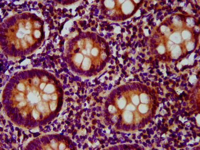 IHC image of CSB-PA008546LA01HU diluted at 1:300 and staining in paraffin-embedded human appendix tissue performed on a Leica BondTM system. After dewaxing and hydration, antigen retrieval was mediated by high pressure in a citrate buffer (pH 6.0). Section was blocked with 10% normal goat serum 30min at RT. Then primary antibody (1% BSA) was incubated at 4°C overnight. The primary is detected by a biotinylated secondary antibody and visualized using an HRP conjugated SP system.