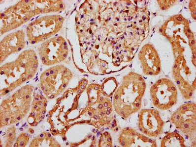 • IHC image of CSB-PA008615ESR2HU diluted at 1:289 and staining in paraffin-embedded human kidney tissue performed on a Leica BondTM system. After dewaxing and hydration, antigen retrieval was mediated by high pressure in a citrate buffer (pH 6.0). Section was blocked with 10% normal goat serum 30min at RT. Then primary antibody (1% BSA) was incubated at 4°C overnight. The primary is detected by a biotinylated secondary antibody and visualized using an HRP conjugated SP system.