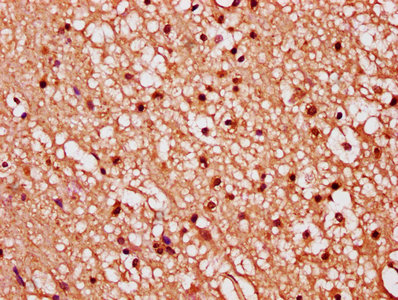 • IHC image of CSB-PA008615ESR2HU diluted at 1:289 and staining in paraffin-embedded human brain tissue performed on a Leica BondTM system. After dewaxing and hydration, antigen retrieval was mediated by high pressure in a citrate buffer (pH 6.0). Section was blocked with 10% normal goat serum 30min at RT. Then primary antibody (1% BSA) was incubated at 4°C overnight. The primary is detected by a biotinylated secondary antibody and visualized using an HRP conjugated SP system.