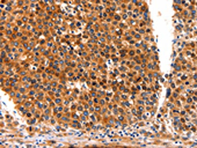 • The image on the left is immunohistochemistry of paraffin-embedded Human liver cancer tissue using CSB-PA086441(FGFR1 Antibody) at dilution 1/60, on the right is treated with fusion protein. (Original magnification: ×200)