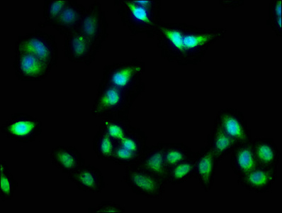 Immunofluorescence staining of Hela cells with CSB-PA008700EA01HU at 1:133, counter-stained with DAPI. The cells were fixed in 4% formaldehyde, permeabilized using 0.2% Triton X-100 and blocked in 10% normal Goat Serum. The cells were then incubated with the antibody overnight at 4°C. The secondary antibody was Alexa Fluor 488-congugated AffiniPure Goat Anti-Rabbit IgG(H+L).