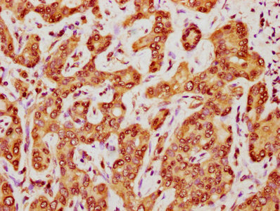 IHC image of CSB-PA008700EA01HU diluted at 1:400 and staining in paraffin-embedded human liver cancer performed on a Leica BondTM system. After dewaxing and hydration, antigen retrieval was mediated by high pressure in a citrate buffer (pH 6.0). Section was blocked with 10% normal goat serum 30min at RT. Then primary antibody (1% BSA) was incubated at 4°C overnight. The primary is detected by a biotinylated secondary antibody and visualized using an HRP conjugated SP system.