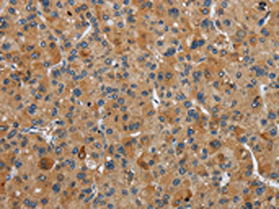 The image on the left is immunohistochemistry of paraffin-embedded Human liver cancer tissue using CSB-PA797254(FLCN Antibody) at dilution 1/40, on the right is treated with fusion protein. (Original magnification: ×200)