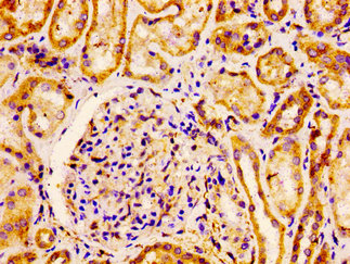 IHC image of CSB-PA008727LA01HU diluted at 1:100 and staining in paraffin-embedded human kidney tissue performed on a Leica BondTM system. After dewaxing and hydration, antigen retrieval was mediated by high pressure in a citrate buffer (pH 6.0). Section was blocked with 10% normal goat serum 30min at RT. Then primary antibody (1% BSA) was incubated at 4°C overnight. The primary is detected by a biotinylated secondary antibody and visualized using an HRP conjugated ABC system.