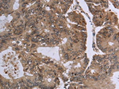 The image on the left is immunohistochemistry of paraffin-embedded Human colon cancer tissue using CSB-PA665086(FOLH1B Antibody) at dilution 1/20, on the right is treated with synthetic peptide. (Original magnification: ×200)