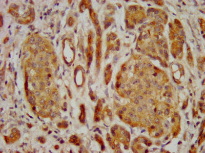 IHC image of CSB-PA722558LA01HU diluted at 1:400 and staining in paraffin-embedded human pancreatic cancer performed on a Leica BondTM system. After dewaxing and hydration, antigen retrieval was mediated by high pressure in a citrate buffer (pH 6.0). Section was blocked with 10% normal goat serum 30min at RT. Then primary antibody (1% BSA) was incubated at 4°C overnight. The primary is detected by a biotinylated secondary antibody and visualized using an HRP conjugated SP system.