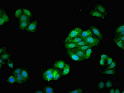 Immunofluorescent analysis of HepG2 cells using CSB-PA619084LA01HU at dilution of 1:100 and Alexa Fluor 488-congugated AffiniPure Goat Anti-Rabbit IgG(H+L)