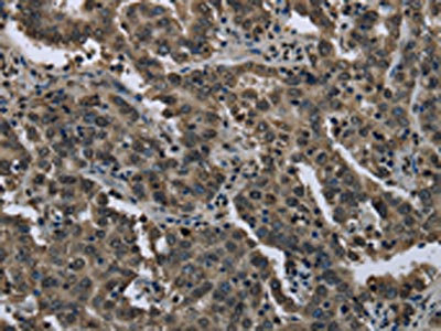 The image on the left is immunohistochemistry of paraffin-embedded Human liver cancer tissue using CSB-PA958648(FTO Antibody) at dilution 1/60, on the right is treated with fusion protein. (Original magnification: ×200)