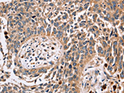 The image on the left is immunohistochemistry of paraffin-embedded Human cervical cancer tissue using CSB-PA799040(FUCA1 Antibody) at dilution 1/30, on the right is treated with fusion protein. (Original magnification: ×200)