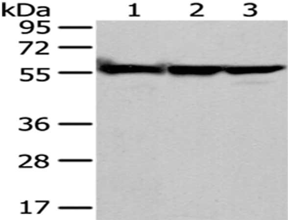 • Gel: 8%SDS-PAGE, Lysate: 40 μg, Lane 1-3: A549, hela and 293T cell, Primary antibody: CSB-PA225018(FYN Antibody) at dilution 1/200 dilution, Secondary antibody: Goat anti rabbit IgG at 1/8000 dilution, Exposure time: 10 seconds