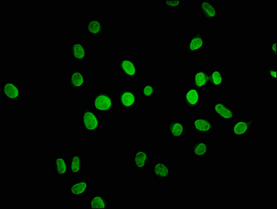 • Immunofluorescence staining of Hela cells (treated with 30mM sodium butyrate for 4h) with CSB-PA010378OA45forHU at 1:5, counter-stained with DAPI. The cells were fixed in 4% formaldehyde, permeabilized using 0.2% Triton X-100 and blocked in 10% normal Goat Serum. The cells were then incubated with the antibody overnight at 4°C. The secondary antibody was Alexa Fluor 488-congugated AffiniPure Goat Anti-Rabbit IgG(H+L).