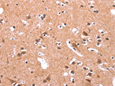 The image on the left is immunohistochemistry of paraffin-embedded Human brain tissue using CSB-PA100614(GABRA1 Antibody) at dilution 1/30, on the right is treated with synthetic peptide. (Original magnification: ×200)