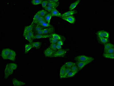• Immunofluorescence staining of HepG2 cells with CSB-PA009163LA01HU at 1:100, counter-stained with DAPI. The cells were fixed in 4% formaldehyde, permeabilized using 0.2% Triton X-100 and blocked in 10% normal Goat Serum. The cells were then incubated with the antibody overnight at 4°C. The secondary antibody was Alexa Fluor 488-congugated AffiniPure Goat Anti-Rabbit IgG(H+L).