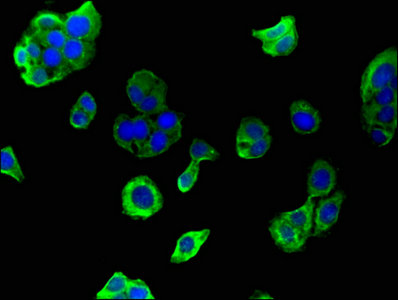 • Immunofluorescent analysis of HepG2 cells using CSB-PA00029A0Rb at dilution of 1:100 and Alexa Fluor 488-congugated AffiniPure Goat Anti-Rabbit IgG(H+L)