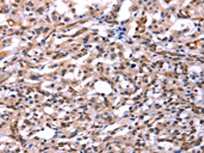 • The image on the left is immunohistochemistry of paraffin-embedded Human gastic cancer tissue using CSB-PA132302(GCG Antibody) at dilution 1/40, on the right is treated with synthetic peptide. (Original magnification: ×200)