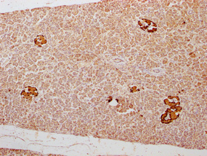 • IHC image of CSB-PA009315LA01HU diluted at 1:300 and staining in paraffin-embedded human pancreatic tissue performed on a Leica BondTM system. After dewaxing and hydration, antigen retrieval was mediated by high pressure in a citrate buffer (pH 6.0). Section was blocked with 10% normal goat serum 30min at RT. Then primary antibody (1% BSA) was incubated at 4°C overnight. The primary is detected by a Goat anti-rabbit polymer IgG labeled by HRP and visualized using 0.05% DAB.