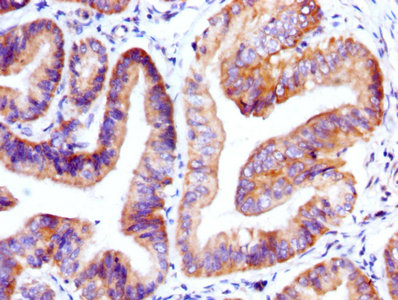 • IHC image of CSB-PA009352EA01HU diluted at 1:400 and staining in paraffin-embedded human endometrial cancer performed on a Leica BondTM system. After dewaxing and hydration, antigen retrieval was mediated by high pressure in a citrate buffer (pH 6.0). Section was blocked with 10% normal goat serum 30min at RT. Then primary antibody (1% BSA) was incubated at 4°C overnight. The primary is detected by a biotinylated secondary antibody and visualized using an HRP conjugated SP system.