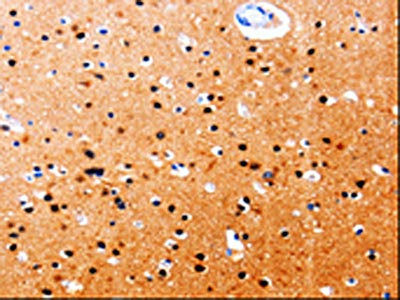 The image on the left is immunohistochemistry of paraffin-embedded Human brain tissue using CSB-PA838764(GDI1 Antibody) at dilution 1/20, on the right is treated with fusion protein. (Original magnification: ×200)