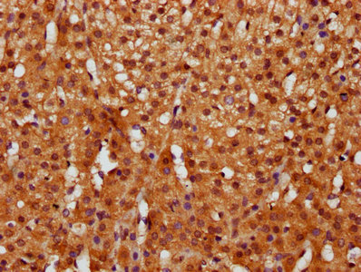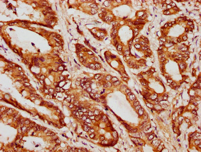 IHC image of CSB-PA009387LA01HU diluted at 1:400 and staining in paraffin-embedded human colon cancer performed on a Leica BondTM system. After dewaxing and hydration, antigen retrieval was mediated by high pressure in a citrate buffer (pH 6.0). Section was blocked with 10% normal goat serum 30min at RT. Then primary antibody (1% BSA) was incubated at 4°C overnight. The primary is detected by a biotinylated secondary antibody and visualized using an HRP conjugated SP system.