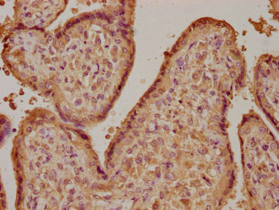 • IHC image of CSB-PA009407LA01HU diluted at 1:100 and staining in paraffin-embedded human placenta tissue performed on a Leica BondTM system. After dewaxing and hydration, antigen retrieval was mediated by high pressure in a citrate buffer (pH 6.0). Section was blocked with 10% normal goat serum 30min at RT. Then primary antibody (1% BSA) was incubated at 4°C overnight. The primary is detected by a biotinylated secondary antibody and visualized using an HRP conjugated SP system.