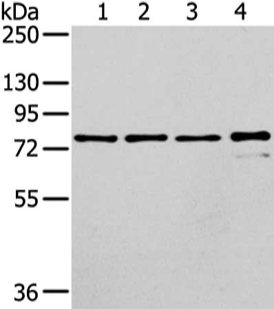 • Gel: 6%SDS-PAGE, Lysate: 40 μg, Lane 1-4: Raji, K562, skov3 and pc3 cell, Primary antibody: CSB-PA381442(GHR Antibody) at dilution 1/400 dilution, Secondary antibody: Goat anti rabbit IgG at 1/8000 dilution, Exposure time: 30 seconds