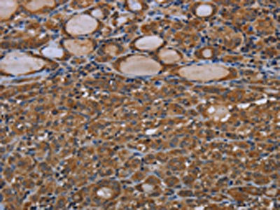 The image on the left is immunohistochemistry of paraffin-embedded Human thyroid cancer tissue using CSB-PA558294(GJB4 Antibody) at dilution 1/40, on the right is treated with synthetic peptide. (Original magnification: ×200)