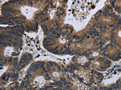 • The image on the left is immunohistochemistry of paraffin-embedded Human colon cancer tissue using CSB-PA209664(GK Antibody) at dilution 1/60, on the right is treated with fusion protein. (Original magnification: ×200)