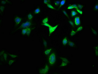 Immunofluorescence staining of HepG2 cells with CSB-PA887058LA01HU at 1:133, counter-stained with DAPI. The cells were fixed in 4% formaldehyde, permeabilized using 0.2% Triton X-100 and blocked in 10% normal Goat Serum. The cells were then incubated with the antibody overnight at 4°C. The secondary antibody was Alexa Fluor 488-congugated AffiniPure Goat Anti-Rabbit IgG(H+L).