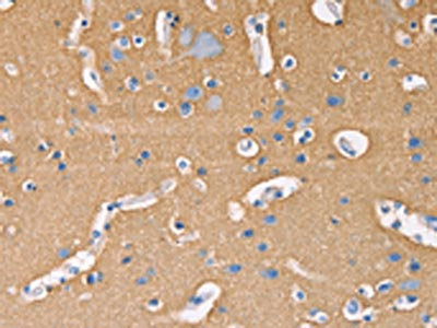 • The image on the left is immunohistochemistry of paraffin-embedded Human brain tissue using CSB-PA897922(GNB1 Antibody) at dilution 1/20, on the right is treated with fusion protein. (Original magnification: ×200)