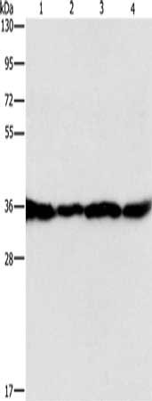 • Gel: 15%SDS-PAGE, Lysate: 40 μg, Lane 1-4: HepG2 cells, A549 cells, 293T cells, 231 cells, Primary antibody: CSB-PA897922(GNB1 Antibody) at dilution 1/400, Secondary antibody: Goat anti rabbit IgG at 1/8000 dilution, Exposure time: 1 second