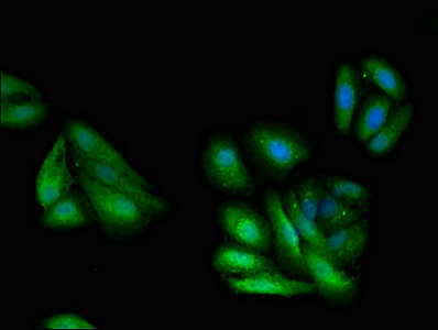 Immunofluorescent analysis of HepG2 cells using CSB-PA009602LA01HU at dilution of 1:100 and Alexa Fluor 488-congugated AffiniPure Goat Anti-Rabbit IgG(H+L)