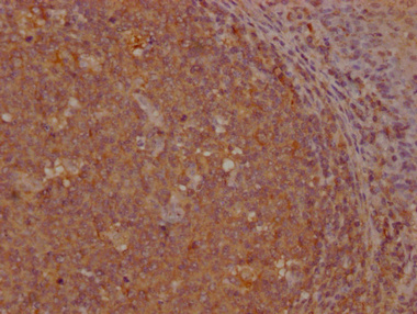 • IHC image of CSB-PA009627LA01HU diluted at 1:200 and staining in paraffin-embedded human tonsil tissue performed on a Leica BondTM system. After dewaxing and hydration, antigen retrieval was mediated by high pressure in a citrate buffer (pH 6.0). Section was blocked with 10% normal goat serum 30min at RT. Then primary antibody (1% BSA) was incubated at 4°C overnight. The primary is detected by a Goat anti-rabbit IgG labeled by HRP and visualized using 0.05% DAB.