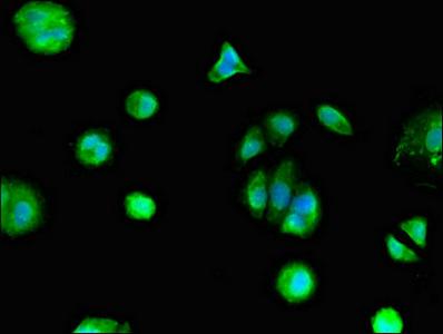 • Immunofluorescent analysis of MCF-7 cells using CSB-PA859933LA01HU at dilution of 1:100 and Alexa Fluor 488-congugated AffiniPure Goat Anti-Rabbit IgG(H+L)