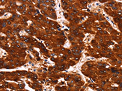 The image on the left is immunohistochemistry of paraffin-embedded Human liver cancer tissue using CSB-PA933888(GPR124 Antibody) at dilution 1/40, on the right is treated with synthetic peptide. (Original magnification: ×200)