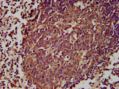 IHC image of CSB-PA887146LA01HU diluted at 1:300 and staining in paraffin-embedded human lymph node tissue performed on a Leica BondTM system. After dewaxing and hydration, antigen retrieval was mediated by high pressure in a citrate buffer (pH 6.0). Section was blocked with 10% normal goat serum 30min at RT. Then primary antibody (1% BSA) was incubated at 4°C overnight. The primary is detected by a biotinylated secondary antibody and visualized using an HRP conjugated SP system.