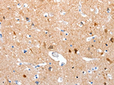 • The image on the left is immunohistochemistry of paraffin-embedded Human brain tissue using CSB-PA363377(GPR6 Antibody) at dilution 1/10, on the right is treated with synthetic peptide. (Original magnification: ×200)