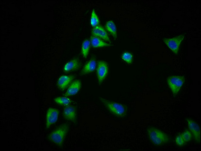 • Immunofluorescence staining of Hela cells with CSB-PA23089A0Rb at 1:166, counter-stained with DAPI. The cells were fixed in 4% formaldehyde, permeabilized using 0.2% Triton X-100 and blocked in 10% normal Goat Serum. The cells were then incubated with the antibody overnight at 4°C. The secondary antibody was Alexa Fluor 488-congugated AffiniPure Goat Anti-Rabbit IgG(H+L).