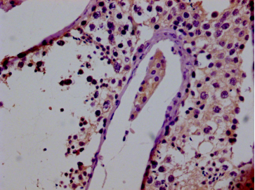 • IHC image of CSB-PA722571LA01HU diluted at 1:50 and staining in paraffin-embedded human testis tissue performed on a Leica BondTM system. After dewaxing and hydration, antigen retrieval was mediated by high pressure in a citrate buffer (pH 6.0). Section was blocked with 10% normal goat serum 30min at RT. Then primary antibody (1% BSA) was incubated at 4°C overnight. The primary is detected by a biotinylated secondary antibody and visualized using an HRP conjugated SP system.