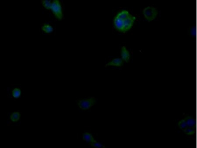 • Immunofluorescence staining of PC-3 cells with CSB-PA722571LA01HU at 1:100, counter- stained with DAPI. The cells were fixed in 4% formaldehyde, permeabilized using 0.2% Triton X-100 and blocked in 10% normal Goat Serum. The cells were then incubated with the antibody overnight at 4°C. The secondary antibody was Alexa Fluor 488-congugated AffiniPure Goat Anti-Rabbit IgG(H+L).