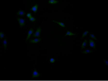 • Immunofluorescence staining of Hela cells with CSB-PA722571LA01HU at 1:100, counter- stained with DAPI. The cells were fixed in 4% formaldehyde, permeabilized using 0.2% Triton X-100 and blocked in 10% normal Goat Serum. The cells were then incubated with the antibody overnight at 4°C. The secondary antibody was Alexa Fluor 488-congugated AffiniPure Goat Anti-Rabbit IgG(H+L).