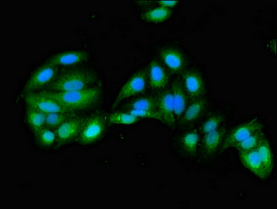 • Immunofluorescent analysis of HepG2 cells using CSB-PA009897HA01HU at dilution of 1:100 and Alexa Fluor 488-congugated AffiniPure Goat Anti-Rabbit IgG(H+L)