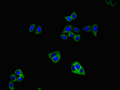 • Immunofluorescent analysis of HepG2 cells using CSB-PA009901LA01HU at dilution of 1:100 and Alexa Fluor 488-congugated AffiniPure Goat Anti-Rabbit IgG(H+L)