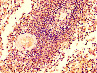 • IHC image of CSB-PA00969A0Rb diluted at 1:500 and staining in paraffin-embedded human spleen tissue performed on a Leica BondTM system. After dewaxing and hydration, antigen retrieval was mediated by high pressure in a citrate buffer (pH 6.0). Section was blocked with 10% normal goat serum 30min at RT. Then primary antibody (1% BSA) was incubated at 4°C overnight. The primary is detected by a biotinylated secondary antibody and visualized using an HRP conjugated SP system.