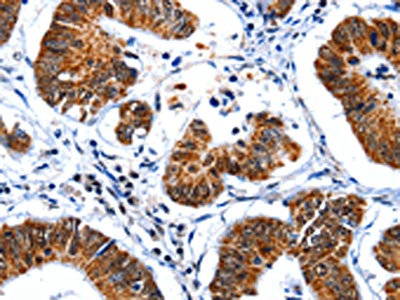 The image on the left is immunohistochemistry of paraffin-embedded Human colon cancer tissue using CSB-PA147596(GSK3A Antibody) at dilution 1/50, on the right is treated with synthetic peptide. (Original magnification: ×200)