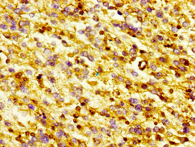 IHC image of CSB-PA009965HA01HU diluted at 1:300 and staining in paraffin-embedded human glioma performed on a Leica BondTM system. After dewaxing and hydration, antigen retrieval was mediated by high pressure in a citrate buffer (pH 6.0). Section was blocked with 10% normal goat serum 30min at RT. Then primary antibody (1% BSA) was incubated at 4°C overnight. The primary is detected by a biotinylated secondary antibody and visualized using an HRP conjugated SP system.