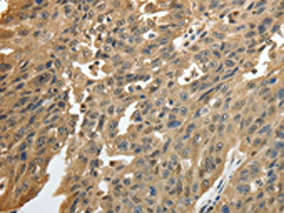 The image on the left is immunohistochemistry of paraffin-embedded Human ovarian cancer tissue using CSB-PA910911(GSR Antibody) at dilution 1/50, on the right is treated with fusion protein. (Original magnification: ×200)