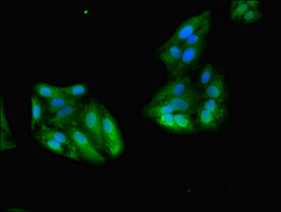 • Immunofluorescent analysis of HepG2 cells using CSB-PA009970LA01HU at dilution of 1:100 and Alexa Fluor 488-congugated AffiniPure Goat Anti-Rabbit IgG(H+L)