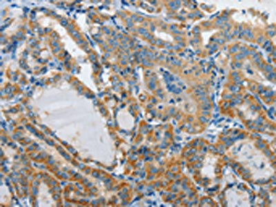 • The image on the left is immunohistochemistry of paraffin-embedded Human thyroid cancer tissue using CSB-PA986806(GZMB Antibody) at dilution 1/15, on the right is treated with fusion protein. (Original magnification: ×200)